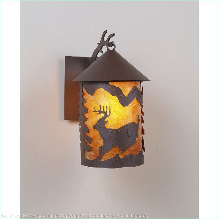 The Cascade Lantern Sconce Medium - Mtn Deer features a steel branch holding up a 6 inch round cylinder with a cone top and a shade diffuser choice of color between Almond or Amber mica. Our exclusive deer metal art is on the front and spruce trees are on either side of the cylinder. Attaches to wall with a 4.5 inch square pan. Hardwire only. Suitable for interior and exterior locations. This rustic wall light is ideal for bringing rustic lighting to any log home, cabin or northwood-themed room.