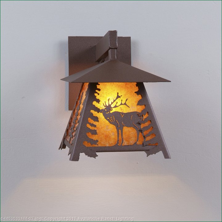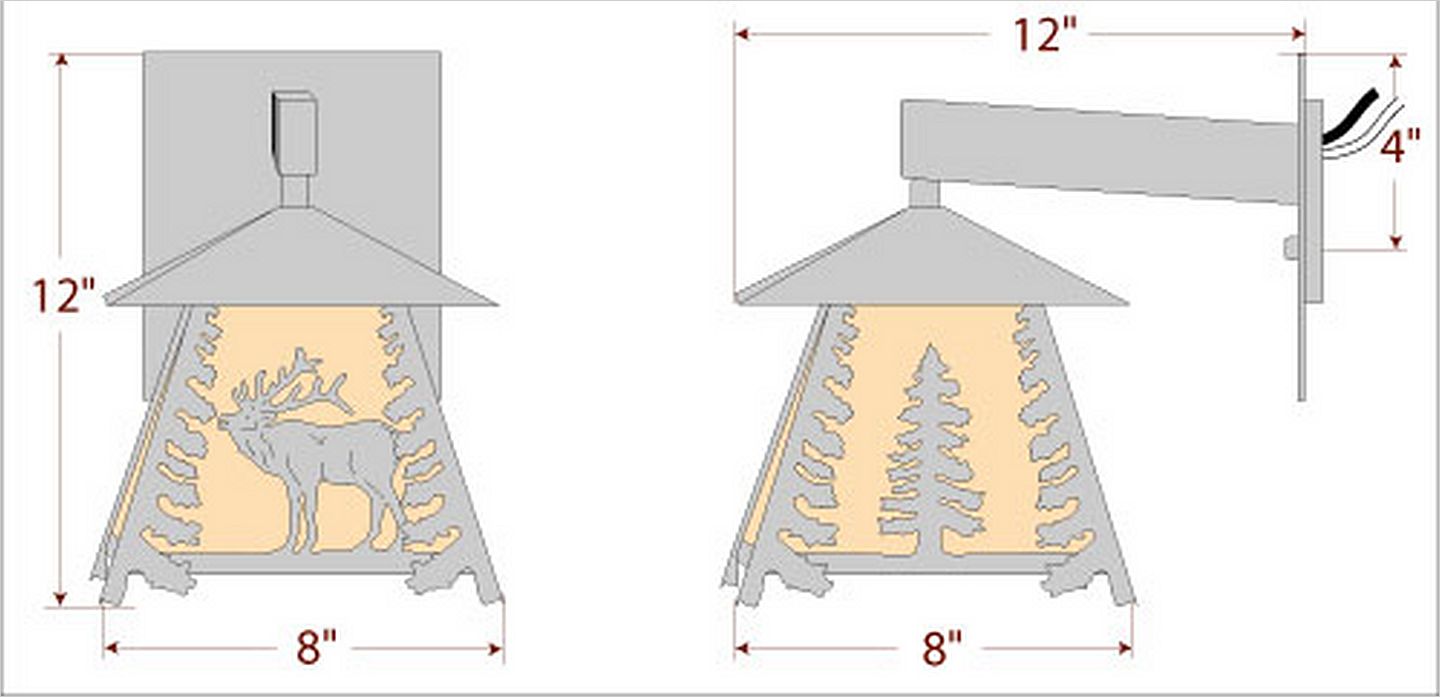 The Smoky Mtn Sconce Small - Elk fixture is UL-rated for indoor and outdoor locations. An elk image is displayed on the two front panels, along with a single spruce tree on the side panels. The fixture has a steel frame, and comes with a diffuser material choice between Almond or Amber mica. The sconce is hardwire only, and attaches to the wall with a 4.5 inch square pan. This light will bring rustic character to any log home, cabin or northwood lodge-themed room.
