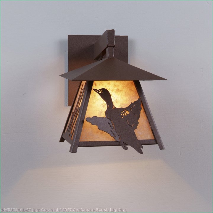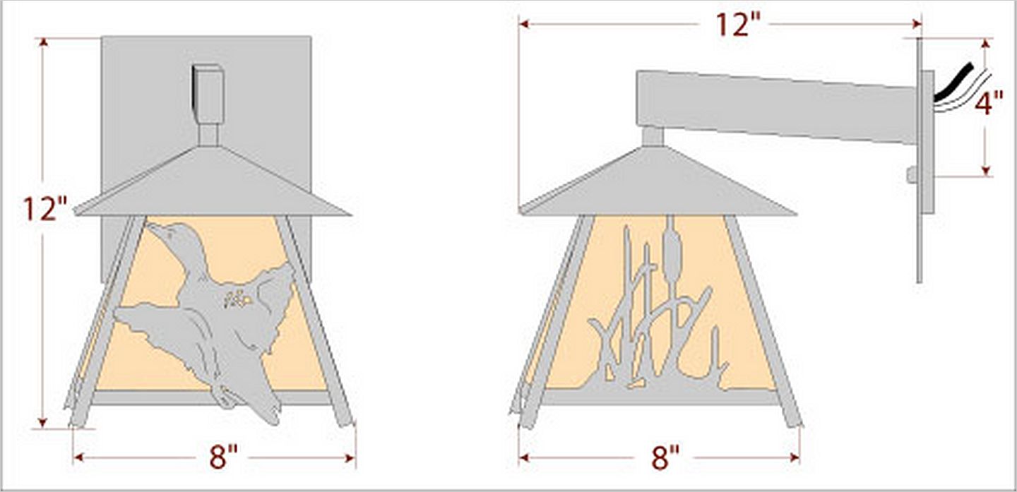 The Smoky Mtn Sconce Small - Loon fixture is UL-rated for indoor and outdoor locations. A loon image is displayed on the two front panels, along with cattail images on the side panels. The fixture has a steel frame, and comes with a diffuser material choice between Almond or Amber mica. The sconce is hardwire only, and attaches to the wall with a 4.5 inch square pan. This light will bring rustic character to any log home, cabin or northwood lodge-themed room.