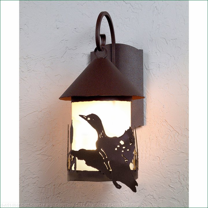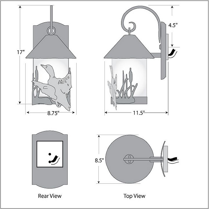 The Vista Lantern Sconce - Loon features an 8 inch tall by 6 inch diameter frosted cylinder glass surrounded by the metal art images of a loon and cattails. This exterior sconce is perfect for anyone looking to bring a touch of rustic wildlife to the outside entrances of their log home, cabin or northwood lodge-themed room. Mounts to a minimum 5 inch square board or wall area. UL approved for Wet Locations.