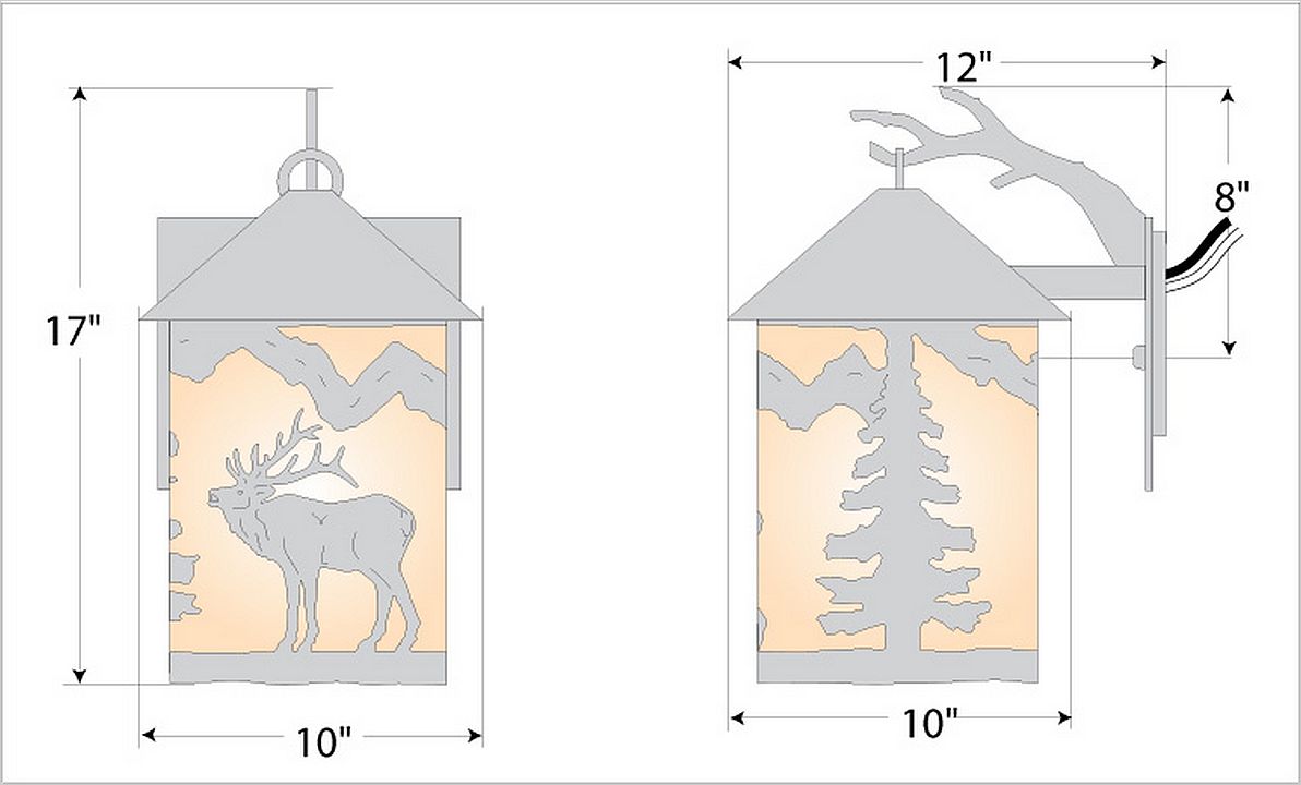 The Cascade Lantern Sconce Large - Mtn Elk features a steel branch holding up a 8 inch round cylinder with a cone top and a shade diffuser choice of color between Almond or Amber mica. Our exclusive elk metal art is on the front and spruce trees are on either side of the cylinder. Attaches to wall with a 4.5 inch square pan. Hardwire only. Suitable for interior and exterior locations. This rustic wall light is ideal for bringing rustic lighting to any log home, cabin or northwood-themed room.