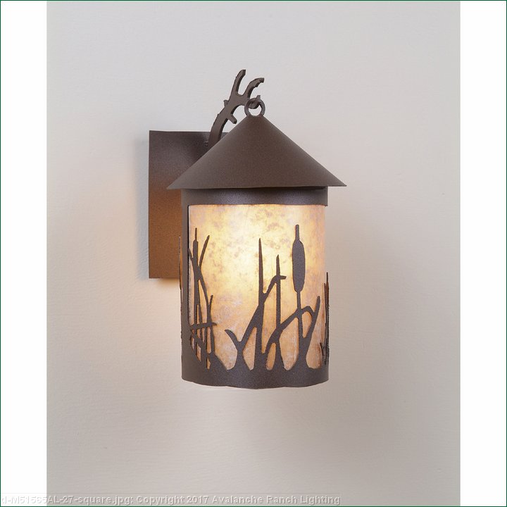 The Cascade Lantern Sconce Medium - Cattails features a steel branch holding up a 6 inch round cylinder with a cone top and a shade diffuser choice of color between Almond or Amber mica. Our exclusive cattails metal art is on the front and solid bands are on either side of the cylinder. Attaches to wall with a 4.5 inch square pan. Hardwire only. Suitable for interior and exterior locations. This rustic wall light is ideal for bringing rustic lighting to any log home, cabin or northwood-themed room.