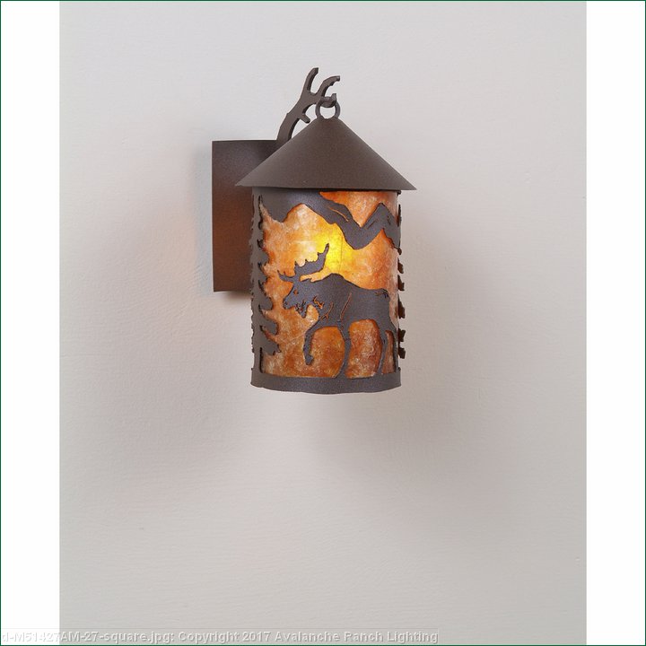 The Cascade Lantern Sconce Small - Mtn Moose features a steel branch holding up a 4 inch round cylinder with a cone top and a shade diffuser choice of color between Almond or Amber mica. Our exclusive moose metal art is on the front and spruce trees are on either side of the cylinder. Attaches to wall with a 4.5 inch square pan. Hardwire only. Suitable for interior and exterior locations. This rustic wall light is ideal for bringing rustic lighting to any log home, cabin or northwood-themed room.