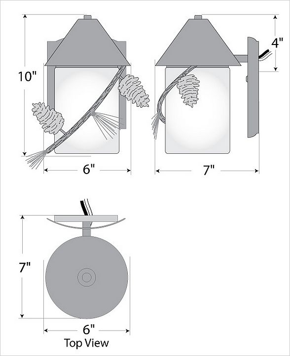 The Cedarline Sconce - Pine Cone sconce is suitable for outdoor and indoor locations and features a frosted white glass cylinder with a handmade steel pine cone and pine needle image on the front of the rustic outdoor light. This light is ideal for anyone wanting to add rustic lighting to the exterior of their log home or cabin. It has a 4 inch square backplate.