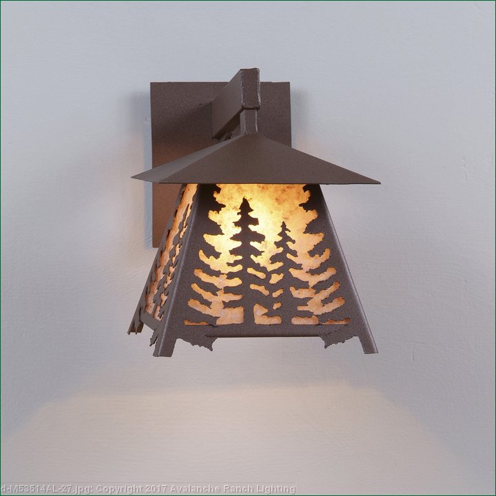 The Smoky Mtn Sconce Small - Spruce fixture is UL-rated for indoor and outdoor locations. A single spruce tree image is displayed on each side panel, with a double spruce tree image on the front panels. The fixture has a steel frame, and comes with a diffuser material choice between Almond or Amber mica. The sconce is hardwire only, and attaches to the wall with a 4.5 inch square pan. This light will bring rustic character to any log home, cabin or northwood lodge-themed room.