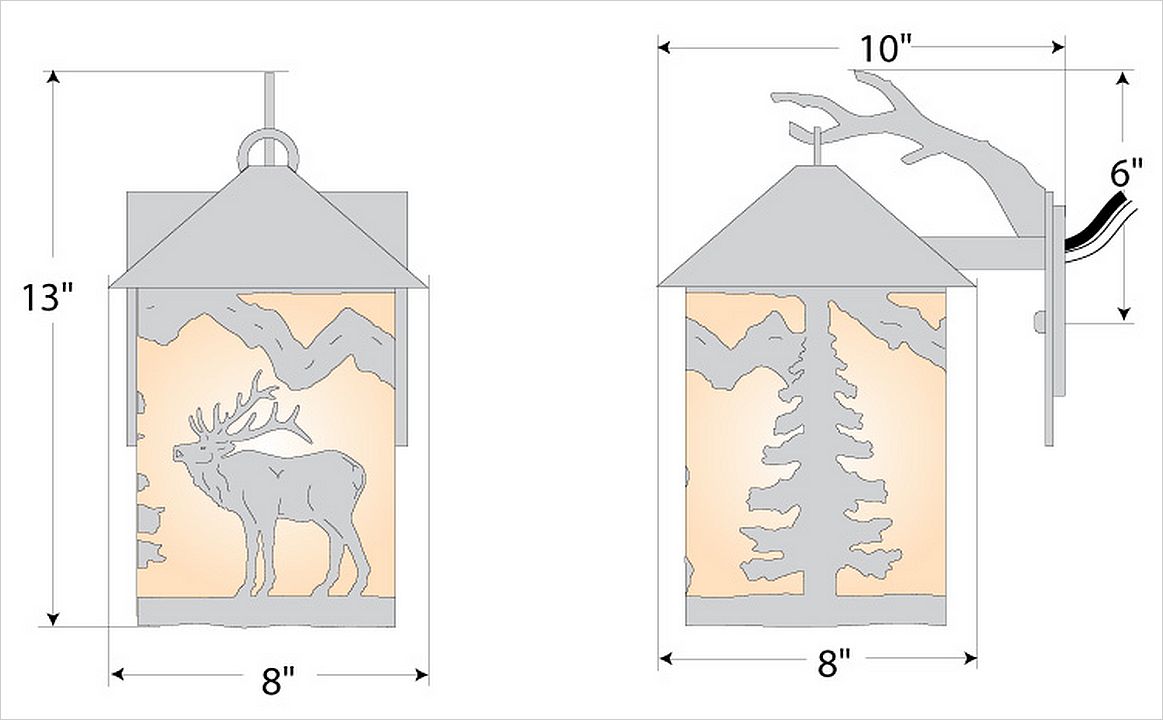 The Cascade Lantern Sconce Medium - Mtn Elk features a steel branch holding up a 6 inch round cylinder with a cone top and a shade diffuser choice of color between Almond or Amber mica. Our exclusive elk metal art is on the front and spruce trees are on either side of the cylinder. Attaches to wall with a 4.5 inch square pan. Hardwire only. Suitable for interior and exterior locations. This rustic wall light is ideal for bringing rustic lighting to any log home, cabin or northwood-themed room.