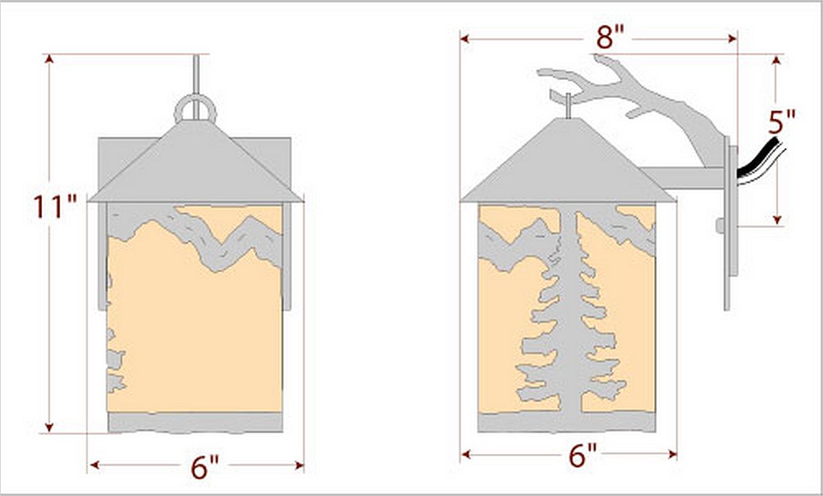The Cascade Lantern Sconce Small - Rustic Plain features a steel branch holding up a 4 inch round cylinder with a cone top and a shade diffuser choice of color between Almond or Amber mica. Mountains are on the front and spruce trees are on either side of the cylinder. Attaches to wall with a 4.5 inch square pan. Hardwire only. Suitable for interior and exterior locations. This rustic wall light is ideal for bringing rustic lighting to any log home, cabin or northwood-themed room.