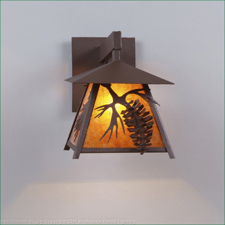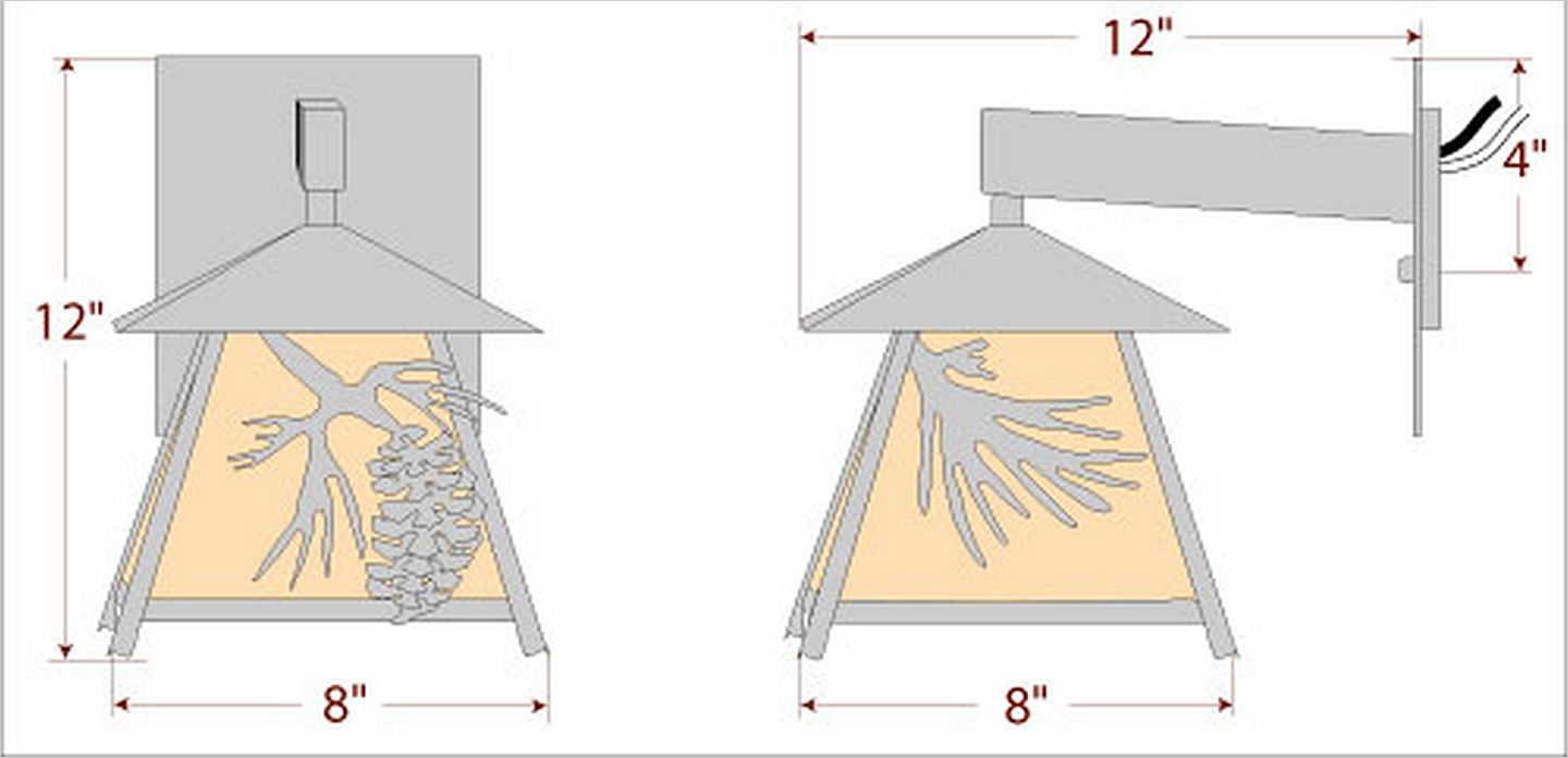 The Smoky Mtn Sconce Small - Spruce Cone fixture is UL-rated for indoor and outdoor locations. Our exclusive Spruce Cone artwork is displayed on the two front panels, with spruce needle images on the side panels. The fixture has a steel frame, and comes with a diffuser material choice between Almond or Amber mica. The sconce is hardwire only, and attaches to the wall with a 4.5 inch square pan. This light will bring rustic character to any log home, cabin or northwood lodge-themed room.