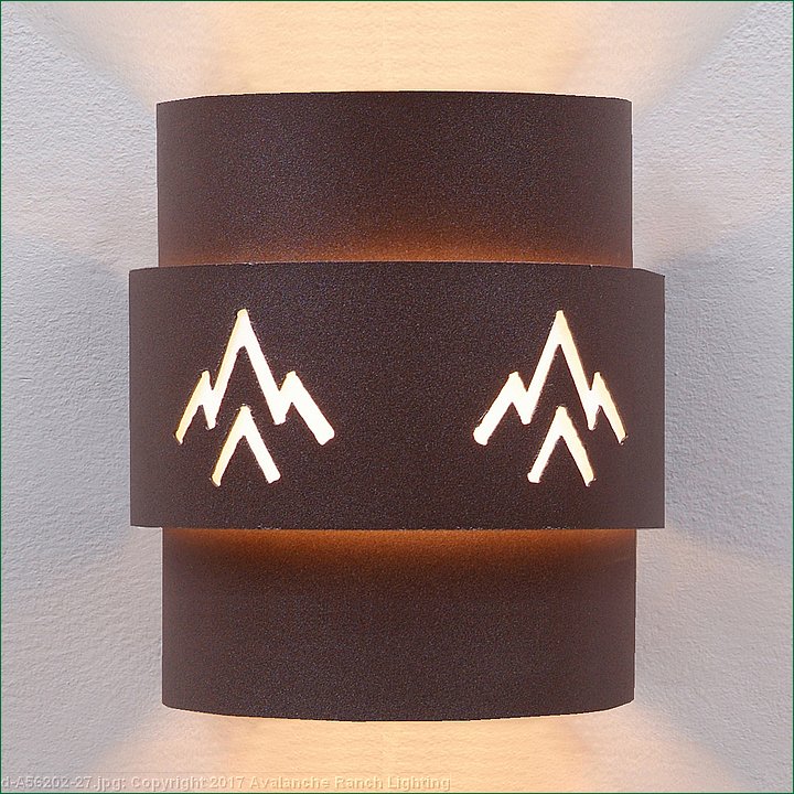 The Northridge Sconce Large - Deception Pass features a steel frame with our exclusive mountain artwork in the center band. The fixture includes one bulb pointing upward and another downward, and a tall glass cylinder to cover the lightbulbs. An acrylic lens also covers the cutout. This Southwest-inspired sconce will provide unique interior or exterior rustic lighting for any log home, cabin or northwood lodge-themed room. Hardwire only. Note: Only powdercoated finishes are recommended for exterior locations.