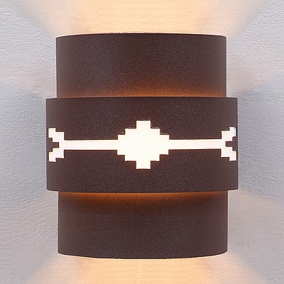 The Northridge Sconce Large - Del Rio features a steel frame with our exclusive southwestern artwork in the center band. The fixture includes one bulb pointing upward and another downward, and a tall glass cylinder to cover the lightbulbs. An acrylic lens also covers the cutout. This Southwest-inspired sconce will provide unique interior or exterior rustic lighting for any log home, cabin or northwood lodge-themed room. Hardwire only. Note: Only powdercoated finishes are recommended for exterior locations.