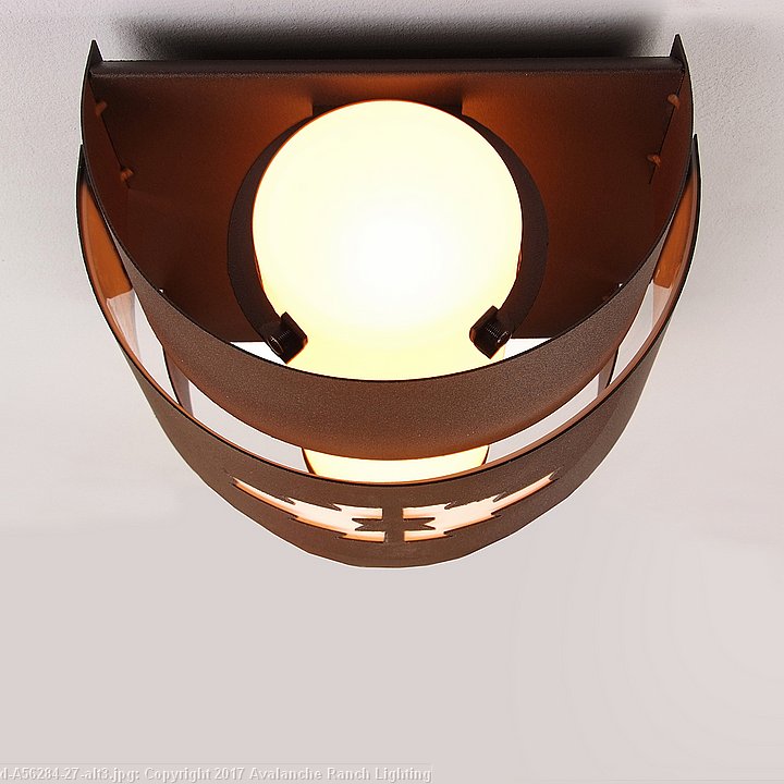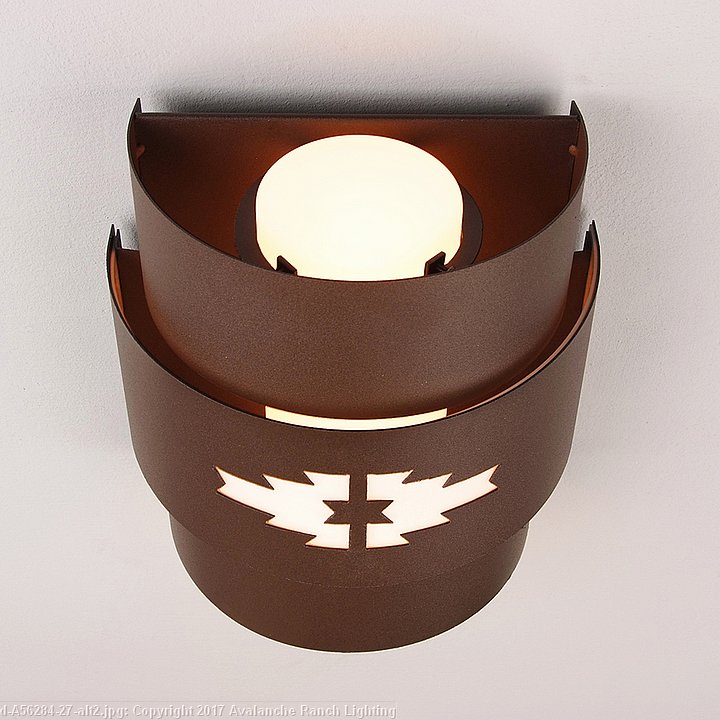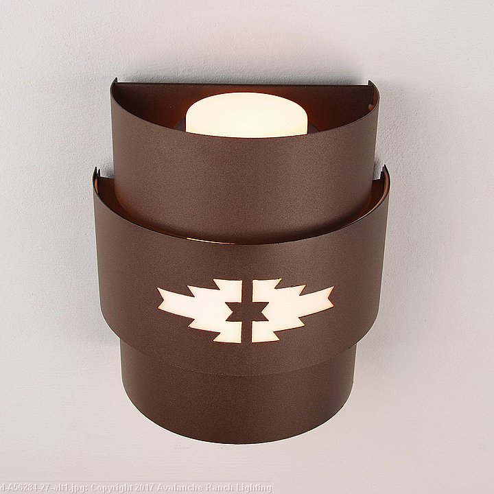 The Northridge Sconce Large - Pueblo features a steel frame with our exclusive southwestern artwork in the center band. The fixture includes one bulb pointing upward and another downward, and a tall glass cylinder to cover the lightbulbs. An acrylic lens also covers the cutout. This Southwest-inspired sconce will provide unique interior or exterior rustic lighting for any log home, cabin or northwood lodge-themed room. Hardwire only. Note: Only powdercoated finishes are recommended for exterior locations.