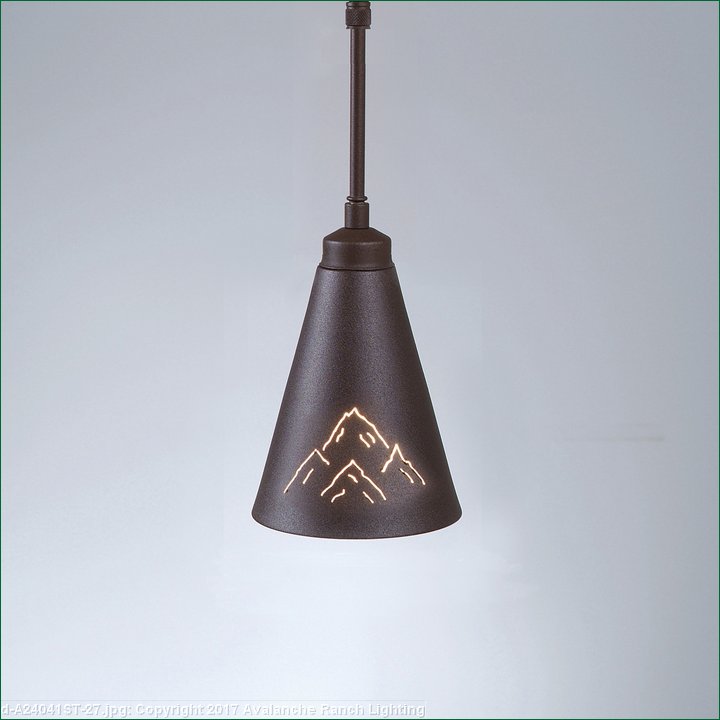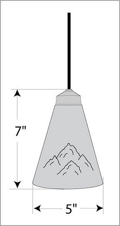 The Canyon Pendant Extra Small - Mountain fixture features two mountain cutouts on the opposite sides of a spun steel cone. This light is ideal for anyone looking for a small hanging light to add rustic character to their log home, cabin or northwoods lodge-themed room. All pendants include a matching ceiling canopy that can be mounted on either a flat or vaulted ceiling. Choice of three ways to hang our pendants: 14 ft black cord (BC), 15 inch - 30in adjustable stem (ST) or 3 ft chain (CH). Black cord or chain hung versions are suitable for interior and damp locations; adjustable stem hung version are suitable for wet locations. Note: Only the Powder Coated Finishes are suitable for wet locations. Hanging choice must be specified at time order.