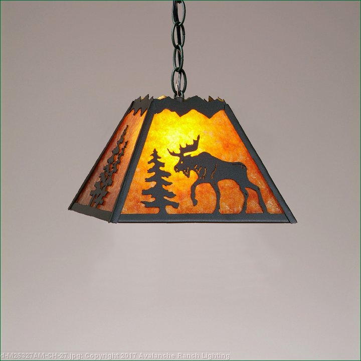 The Rocky Mtn Pendant Small - Mtn Moose features a 12in. wide by 8in. tall steel frame, with a moose image displayed on the two front panels, and a double spruce image on the side panels. The fixture includes a square ceiling canopy that can be mounted on either a flat or vaulted ceiling, and comes with a diffuser material choice between Almond or Amber mica. You can choose from the following three hanging choices: a 14 ft black cord (BC), a 15in.-30in. adjustable stem (ST), or 3' of chain (CH). Suitable for interior locations only. This small pendant will add rustic character to any log home, cabin, or northwoods lodge-themed room.