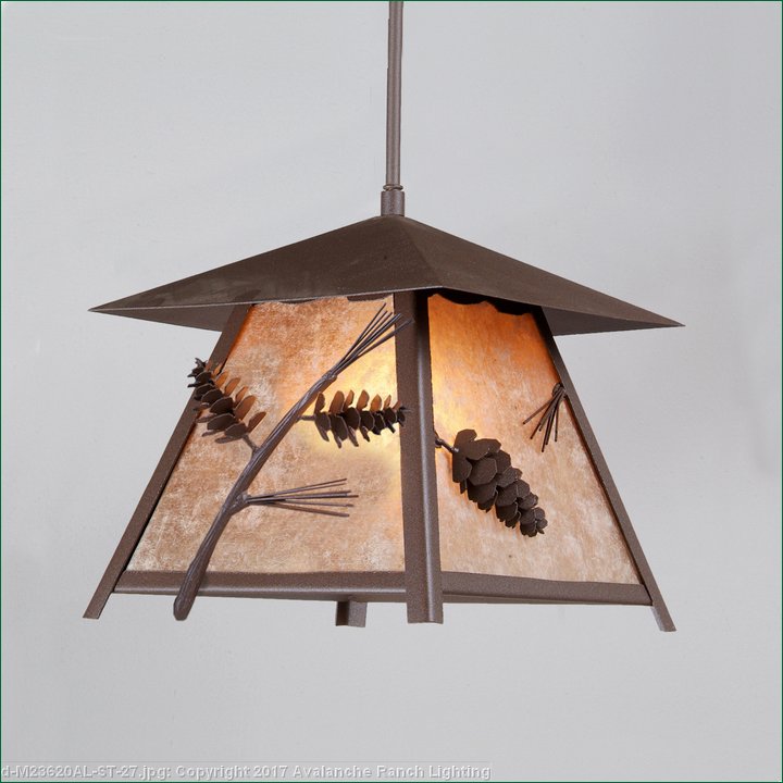 The Smoky Mtn Pendant Large - Pine Cone features our exclusive steel pine cone branches on the two front panels, along with 3D pine cone artwork on the side panels. The fixture has a steel frame, and comes with a diffuser material choice between Almond or Amber mica. Included is a square ceiling canopy that can be mounted on either a flat or vaulted ceiling. You can choose from the following three hanging choices: a 14 ft black cord (BC), a 15in.-30in. adjustable stem (ST), or 3' of chain (CH). The black cord and chain-hung versions are suitable for interior and damp locations, and the adjustable stem-hung version is suitable for wet locations. This small hanging light will add a rustic character to any log home, cabin, or northwoods lodge-themed room.