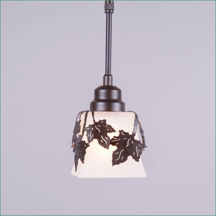 The Woodland Pendant - Maple features square mission style glass and simple leaf designs surrounding the glass. The Maple leaves have hand-cut interior lines which gives each image a unique look. Choice of glass color between Frost Clear and Tea-Stained. All pendants include a matching ceiling canopy that can be mounted on either a flat or vaulted ceiling. Choice of three ways to hang our pendants: 14 ft black cord (BC), 15 inch - 30in adjustable stem (ST) or 3 ft chain (CH). Black cord or chain hung versions are suitable for interior and damp locations; adjustable stem hung version are suitable for wet locations. Note: Only the Powder Coated Finishes are suitable for wet locations. Hanging choice must be specified at time order.