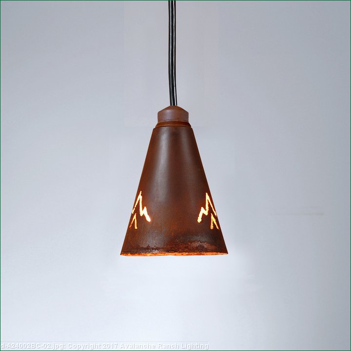 The Canyon Pendant Extra Small - Deception Pass features a heavy gauge spun steel cone with two hand-cut mountain patterns on the sides. This Southwest-inspired light is ideal for anyone looking for a smaller hanging light to add rustic character to their log home, cabin or northwood lodge-themed room. All pendants include a matching ceiling canopy that can be mounted on either a flat or vaulted ceiling. Choice of three ways to hang our pendants: 14 ft black cord (BC), 15 inch - 30in adjustable stem (ST) or 3 ft chain (CH). Black cord or chain hung versions are suitable for interior and damp locations; adjustable stem hung version are suitable for wet locations. Note: Only the Powder Coated Finishes are suitable for wet locations. Hanging choice must be specified at time order.