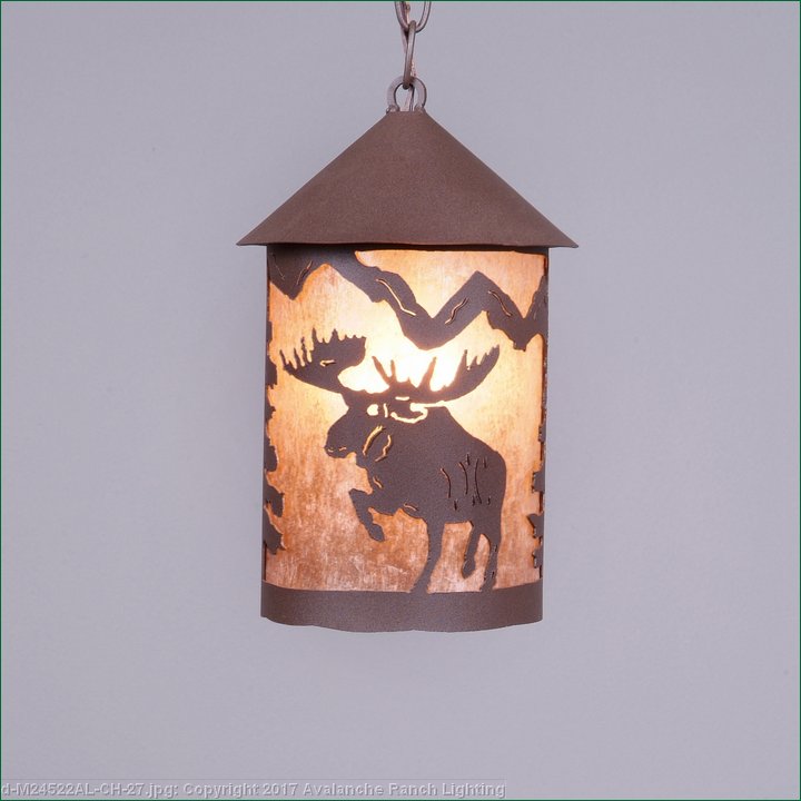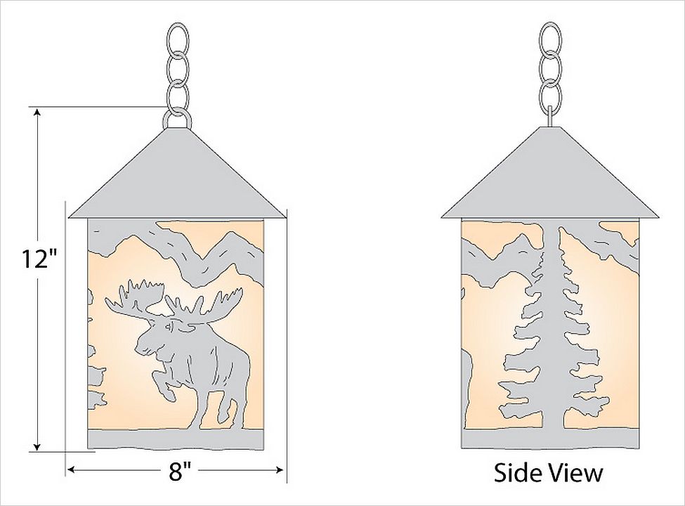 The Cascade Pendant Medium - Alaska Moose features our exclusive moose art on the front and back, with spruce trees on either side of the round cylinder. Diffuser choice between Almond or Amber mica. Includes a round ceiling canopy that can be mounted on either a flat or vaulted ceiling. Choice of three ways to hang our pendants: 14 ft black cord, 15 to 27 inch adjustable stem or 3 feet of chain. Black cord or chain hung versions are suitable for interior and damp locations; adjustable stem hung version are also suitable for wet locations. Hanging choice must be specified at time order. Note: Only the Powder Coated Finishes are suitable for wet locations. This rustic pendant is ideal for anyone looking for a small hanging light to add rustic character to their log home, cabin or northwoods lodge-themed room. Includes a round ceiling canopy that can be mounted on either a flat or vaulted ceiling.