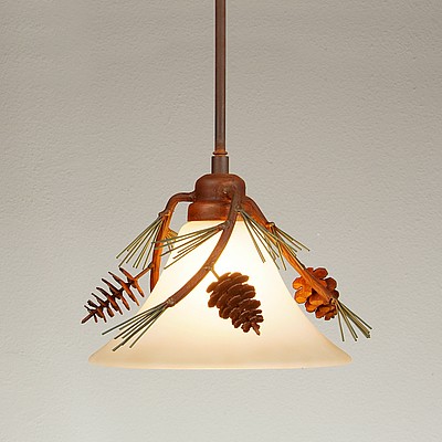 The Cedarwood Pendant - Pine Cone features our exclusive handmade metal pine cones and pine needles attached to a textured metal branch and a choice of glass between two different glass cones. All pendants include a matching ceiling canopy that can be mounted on either a flat or vaulted ceiling. There is a hanging choice of 14 ft black cord (BC), 15 inch - 30 inch adjustable stem (ST) or 3 feet of chain (CH). Hanging choice must be specified at time of order. This pendant is a great for that hanging over a kitchen island or resturant tables - anywhere to add warm lighting and rustic charcter to their log home, cabin or northwood lodge-themed room.