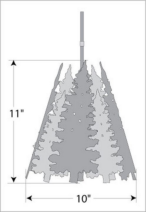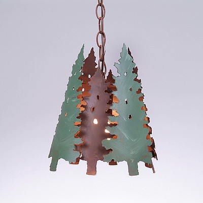 The Pine Nook Pendant is a small hanging light which features a shade made from pine tree images surrounding the bulb. This pendant is ideal for anyone looking for a small hanging light to add warm lighting and rustic charcter to their log home, cabin or northwood lodge-themed room. All pendants include a matching ceiling canopy that can be mounted on either a flat or vaulted ceiling. There is a hanging choice of 14 ft black cord (BC), 15 inch - 30in adjustable stem (ST) or 3 ft chain (CH). Hanging choice must be specified at time of order. Suitable for interior locations only.