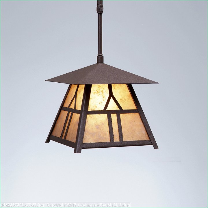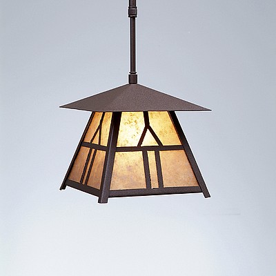 The Smoky Mtn Pendant Extra Small - Westhill features our exclusive mission-style artwork on all four panels. The fixture has a steel frame, and comes with a diffuser material choice between Almond or Amber mica. Included is a square ceiling canopy that can be mounted on either a flat or vaulted ceiling. You can choose from the following three hanging choices: a 14 ft black cord (BC), a 15'-30' adjustable stem (ST), or 3' of chain (CH). The black cord and chain-hung versions are suitable for interior and damp locations, and the adjustable stem-hung version is suitable for wet locations. This craftsman pendant will bring warm lighting and character to any cottage, home, or mission-styled room.