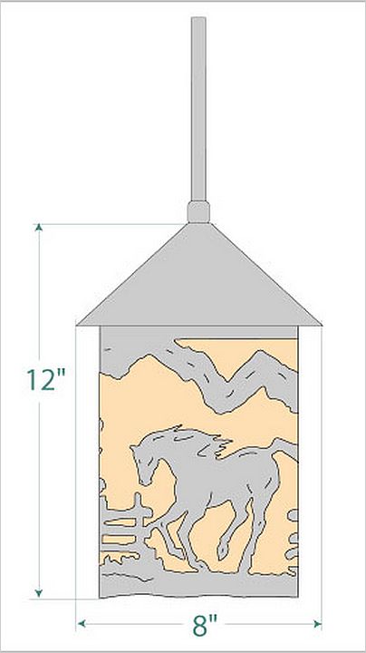 The Cascade Pendant Medium - Mtn Horse features our exclusive horse art on the front and back, with spruce trees on either side of the round cylinder. Diffuser choice between Almond or Amber mica. Includes a round ceiling canopy that can be mounted on either a flat or vaulted ceiling. Choice of three ways to hang our pendants: 14 ft black cord, 15 to 27 inch adjustable stem or 3 feet of chain. Black cord or chain hung versions are suitable for interior and damp locations; adjustable stem hung version are also suitable for wet locations. Hanging choice must be specified at time order. Note: Only the Powder Coated Finishes are suitable for wet locations. This rustic western pendant is ideal for anyone looking for a small hanging light to add rustic character to their log home, cabin or northwoods lodge-themed room. Includes a round ceiling canopy that can be mounted on either a flat or vaulted ceiling.