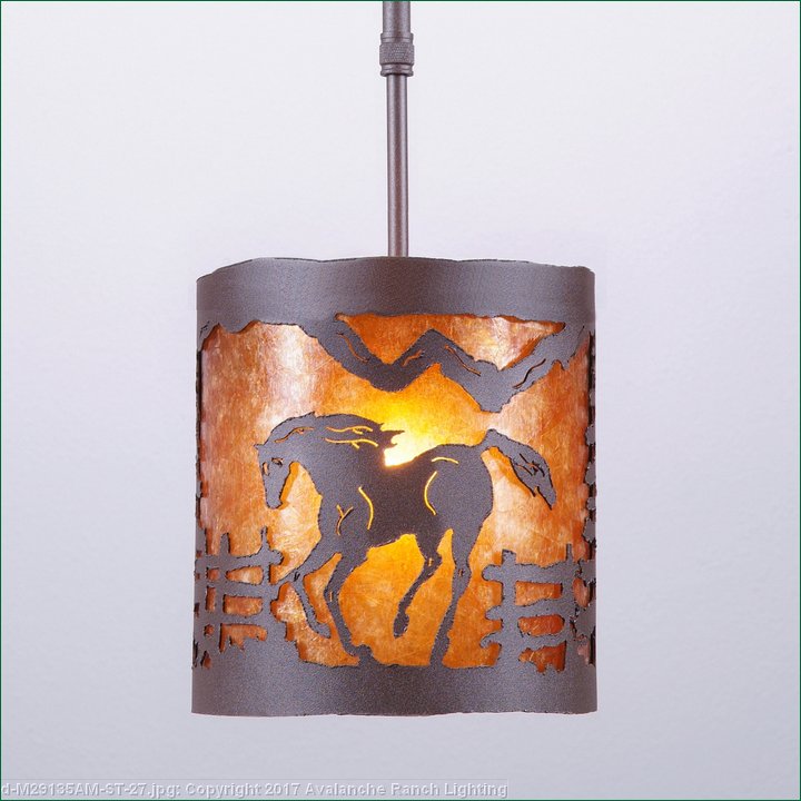 The Kincaid Pendant Small - Mtn Horse features our exclusive horse art on the front and back, with spruce trees on either side of the round cylinder. Diffuser choice between Almond or Amber mica, with an open top and bottom. Includes a round ceiling canopy that can be mounted on either a flat or vaulted ceiling. Choice of three ways to hang our pendants: 14 ft black cord, 15 to 27 inch adjustable stem or 3 feet of chain. Hanging choice must be specified at time order. This rustic western pendant is ideal for anyone looking for a small hanging light to add rustic character to their log home, cabin or northwoods lodge-themed room. Includes a round ceiling canopy that can be mounted on either a flat or vaulted ceiling.
