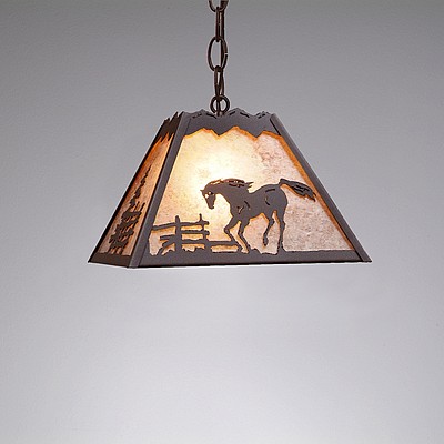The Rocky Mtn Pendant Small - Mtn Horse features a 12in. wide by 8in. tall steel frame, with a horse and fence image displayed on the two front panels, and a single spruce and fence image on the side panels. The fixture includes a square ceiling canopy that can be mounted on either a flat or vaulted ceiling, and comes with a diffuser material choice between Almond or Amber mica. You can choose from the following three hanging choices: a 14 ft black cord (BC), a 15in.-30in. adjustable stem (ST), or 3' of chain (CH). Suitable for interior locations only. This small pendant will add rustic character to any log home, cabin, or northwoods lodge-themed room.