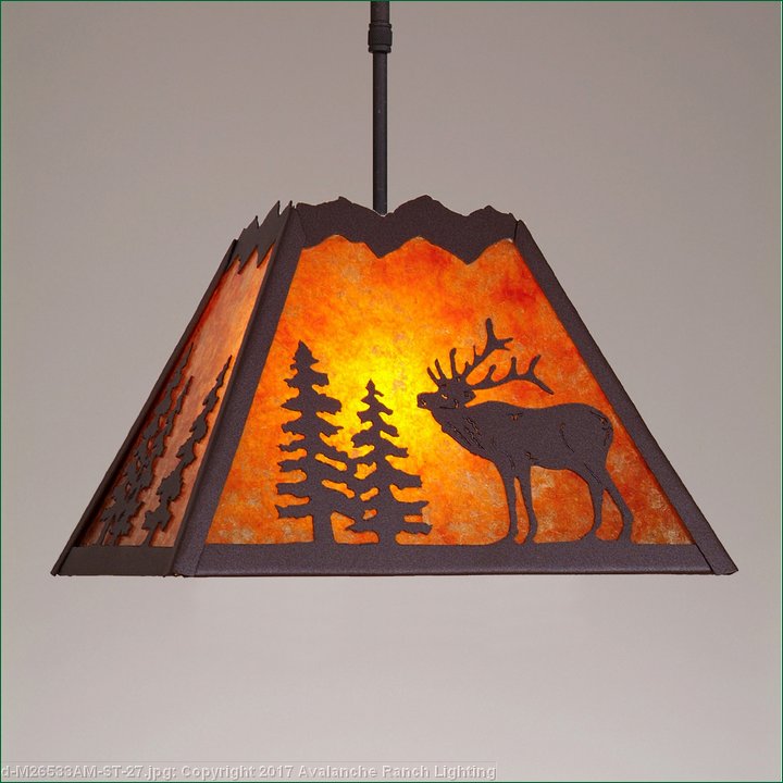 The Rocky Mtn Pendant Large - Mtn Elk features a 15in. wide by 10in. tall steel frame, with an elk image displayed on the two front panels, and spruce tree metal artwork on the side panels. The fixture includes a square ceiling canopy that can be mounted on either a flat or vaulted ceiling, and comes with a diffuser material choice between Almond or Amber mica. You can choose from the following three hanging choices: a 14 ft black cord (BC), a 15in.-30in. adjustable stem (ST), or 3' of chain (CH). Suitable for interior locations only. This pendant will add rustic character to any log home, cabin, or northwoods lodge-themed room.