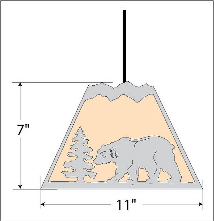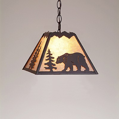 The Rocky Mtn Pendant Small - Mtn Bear features a 12in. wide by 8in. tall steel frame, with a bear image displayed on the two front panels, and a double spruce image on the side panels. The fixture includes a square ceiling canopy that can be mounted on either a flat or vaulted ceiling, and comes with a diffuser material choice between Almond or Amber mica. You can choose from the following three hanging choices: a 14 ft black cord (BC), a 15in.-30in. adjustable stem (ST), or 3' of chain (CH). Suitable for interior locations only. This small pendant will add rustic character to any log home, cabin, or northwoods lodge-themed room.