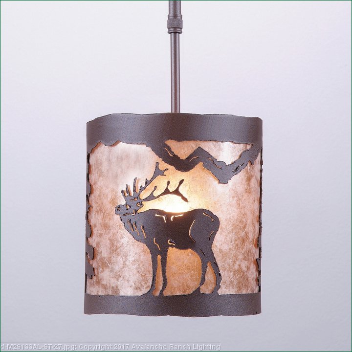 The Kincaid Pendant Small - Mtn Elk features our exclusive elk art on the front and back, with spruce trees on either side of the round cylinder. Diffuser choice between Almond or Amber mica, with an open top and bottom. Includes a round ceiling canopy that can be mounted on either a flat or vaulted ceiling. Choice of three ways to hang our pendants: 14 ft black cord, 15 to 27 inch adjustable stem or 3 feet of chain. Hanging choice must be specified at time order. This rustic pendant is ideal for anyone looking for a small hanging light to add rustic character to their log home, cabin or northwoods lodge-themed room. Includes a round ceiling canopy that can be mounted on either a flat or vaulted ceiling.