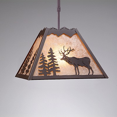The Rocky Mtn Pendant Large - Valley Elk features a 15in. wide by 10in. tall steel frame, with an elk image displayed on the two front panels, and spruce tree metal artwork on the side panels. The fixture includes a square ceiling canopy that can be mounted on either a flat or vaulted ceiling, and comes with a diffuser material choice between Almond or Amber mica. You can choose from the following three hanging choices: a 14 ft black cord (BC), a 15in.-30in. adjustable stem (ST), or 3' of chain (CH). Suitable for interior locations only. This pendant will add rustic character to any log home, cabin, or northwoods lodge-themed room.
