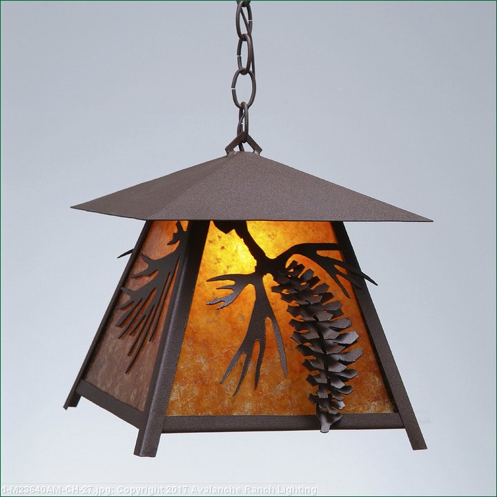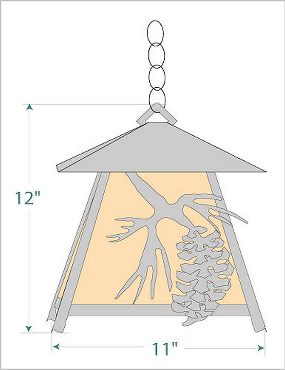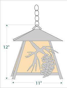 The Smoky Mtn Pendant Large - Spruce Cone features our exclusive Spruce Cone image on the two front panels, with spruce needle images on the side panels. The fixture has a steel frame, and comes with a diffuser material choice between Almond or Amber mica. Included is a square ceiling canopy that can be mounted on either a flat or vaulted ceiling. You can choose from the following three hanging choices: a 14 ft black cord (BC), a 15in.-30in. adjustable stem (ST), or 3' of chain (CH). The black cord and chain-hung versions are suitable for interior and damp locations, and the adjustable stem-hung version is suitable for wet locations. This small hanging light will add a rustic character to any log home, cabin, or northwoods lodge-themed room.