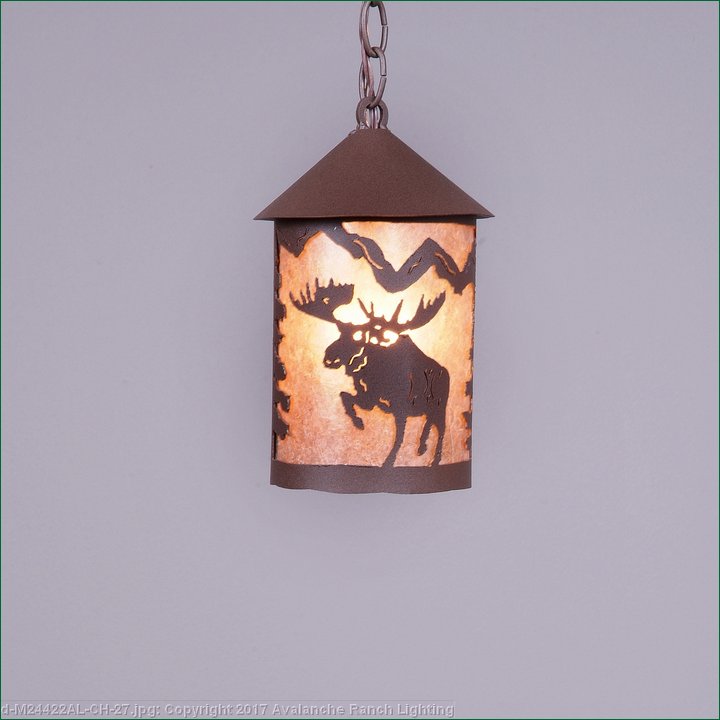 The Cascade Pendant Small - Alaska Moose features our exclusive moose art on the front and back, with spruce trees on either side of the round cylinder. Diffuser choice between Almond or Amber mica. Includes a round ceiling canopy that can be mounted on either a flat or vaulted ceiling. Choice of three ways to hang our pendants: 14 ft black cord, 15 to 27 inch adjustable stem or 3 feet of chain. Black cord or chain hung versions are suitable for interior and damp locations; adjustable stem hung version are also suitable for wet locations. Hanging choice must be specified at time order. Note: Only the Powder Coated Finishes are suitable for wet locations. This rustic pendant is ideal for anyone looking for a small hanging light to add rustic character to their log home, cabin or northwoods lodge-themed room. Includes a round ceiling canopy that can be mounted on either a flat or vaulted ceiling.