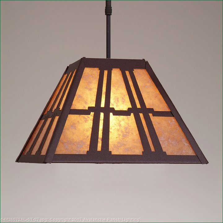 The Rocky Mtn Pendant Large - Eastlake features a 15in. wide by 10in. tall steel frame, with our exclusive mission-style artwork displayed on all four panels. The fixture includes a square ceiling canopy that can be mounted on either a flat or vaulted ceiling, and comes with a diffuser material choice between Almond or Amber mica. You can choose from the following three hanging choices: a 14 ft black cord (BC), a 15in.-30in. adjustable stem (ST), or 3' of chain (CH). Suitable for interior locations only. This pendant will bring mission character to any cottage, home, or craftsman-styled room.
