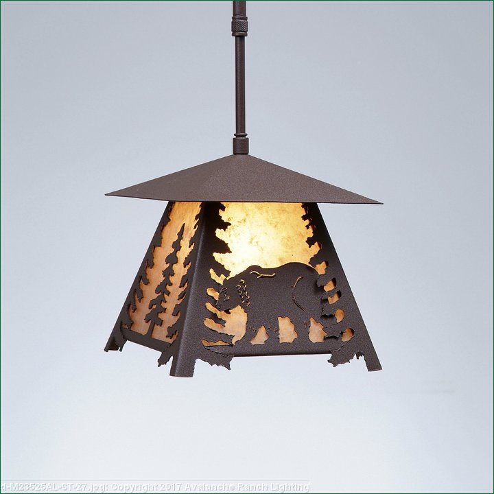 The Smoky Mtn Pendant Small - Bear features a bear image on the two front panels, along with a single spruce tree on the side panels. The fixture has a steel frame, and comes with a diffuser material choice between Almond or Amber mica. Included is a square ceiling canopy that can be mounted on either a flat or vaulted ceiling. You can choose from the following three hanging choices: a 14 ft black cord (BC), a 15in.-30in. adjustable stem (ST), or 3' of chain (CH). The black cord and chain-hung versions are suitable for interior and damp locations, and the adjustable stem-hung version is suitable for wet locations. This small hanging light will add a rustic character to any log home, cabin, or northwoods lodge-themed room.