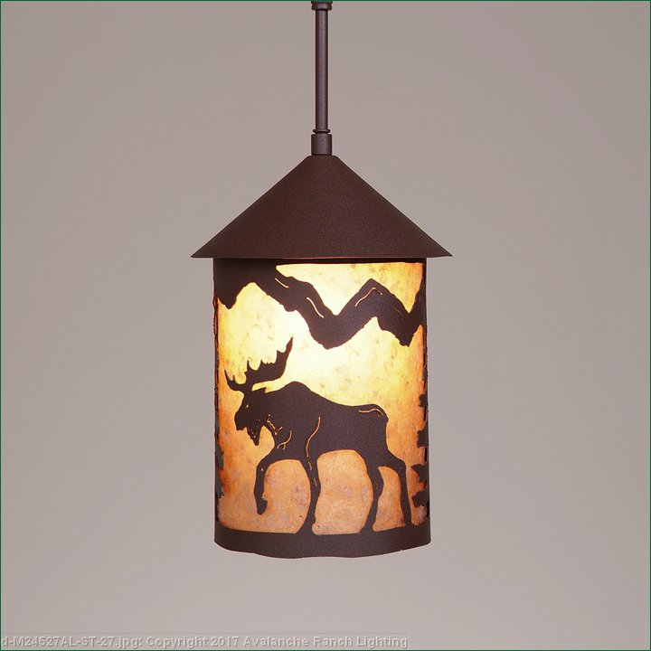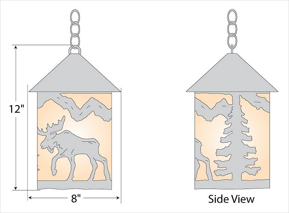 The Cascade Pendant Medium - Mtn Moose features our exclusive moose art on the front and back, with spruce trees on either side of the round cylinder. Diffuser choice between Almond or Amber mica. Includes a round ceiling canopy that can be mounted on either a flat or vaulted ceiling. Choice of three ways to hang our pendants: 14 ft black cord, 15 to 27 inch adjustable stem or 3 feet of chain. Black cord or chain hung versions are suitable for interior and damp locations; adjustable stem hung version are also suitable for wet locations. Hanging choice must be specified at time order. Note: Only the Powder Coated Finishes are suitable for wet locations. This rustic pendant is ideal for anyone looking for a small hanging light to add rustic character to their log home, cabin or northwoods lodge-themed room. Includes a round ceiling canopy that can be mounted on either a flat or vaulted ceiling.