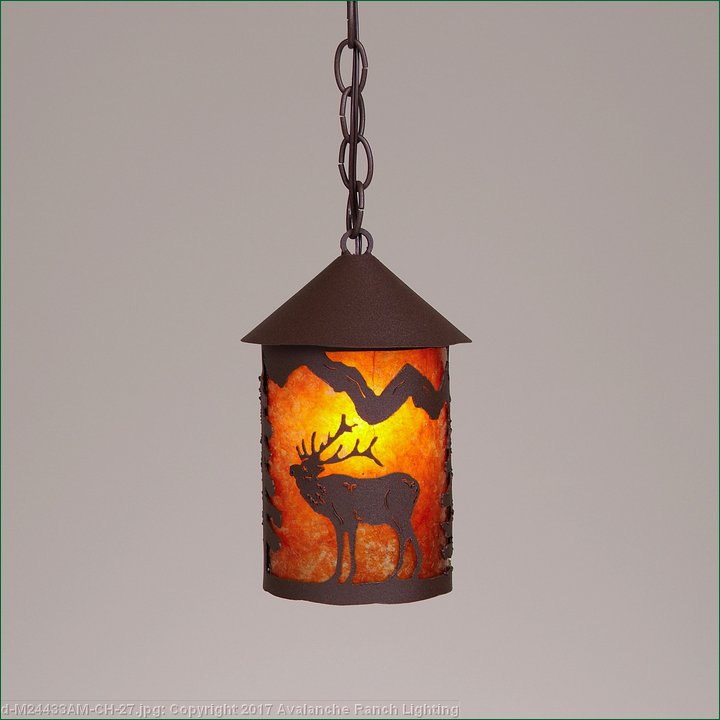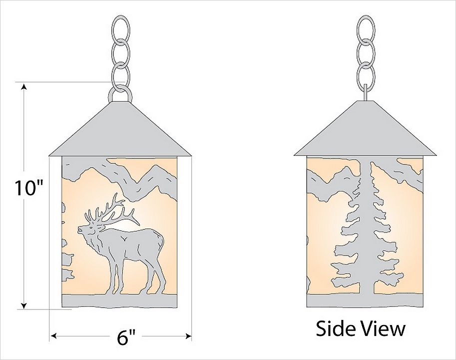 The Cascade Pendant Small - Mtn Elk features our exclusive elk art on the front and back, with spruce trees on either side of the round cylinder. Diffuser choice between Almond or Amber mica. Includes a round ceiling canopy that can be mounted on either a flat or vaulted ceiling. Choice of three ways to hang our pendants: 14 ft black cord, 15 to 27 inch adjustable stem or 3 feet of chain. Black cord or chain hung versions are suitable for interior and damp locations; adjustable stem hung version are also suitable for wet locations. Hanging choice must be specified at time order. Note: Only the Powder Coated Finishes are suitable for wet locations. This rustic pendant is ideal for anyone looking for a small hanging light to add rustic character to their log home, cabin or northwoods lodge-themed room. Includes a round ceiling canopy that can be mounted on either a flat or vaulted ceiling.