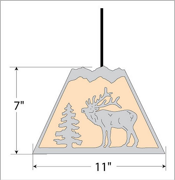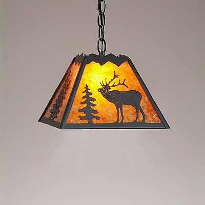 The Rocky Mtn Pendant Small - Mtn Elk features a 12in. wide by 8in. tall steel frame, with an elk image displayed on the two front panels, and a double spruce image on the side panels. The fixture includes a square ceiling canopy that can be mounted on either a flat or vaulted ceiling, and comes with a diffuser material choice between Almond or Amber mica. You can choose from the following three hanging choices: a 14 ft black cord (BC), a 15in.-30in. adjustable stem (ST), or 3' of chain (CH). Suitable for interior locations only. This small pendant will add rustic character to any log home, cabin, or northwoods lodge-themed room.