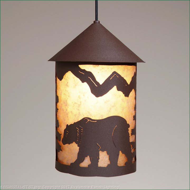 The Cascade Pendant Large - Mtn Bear features our exclusive bear art on the front and back, with spruce trees on either side of the round cylinder. Diffuser choice between Almond or Amber mica. Includes a round ceiling canopy that can be mounted on either a flat or vaulted ceiling. Choice of three ways to hang our pendants: 14 ft black cord, 15 to 27 inch adjustable stem or 3 feet of chain. Black cord or chain hung versions are suitable for interior and damp locations; adjustable stem hung version are also suitable for wet locations. Hanging choice must be specified at time order. Note: Only the Powder Coated Finishes are suitable for wet locations. This rustic pendant is ideal for anyone looking for a small hanging light to add rustic character to their log home, cabin or northwoods lodge-themed room. Includes a round ceiling canopy that can be mounted on either a flat or vaulted ceiling.