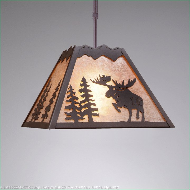 The Rocky Mtn Pendant Large - Alaska Moose features a 15in. wide by 10in. tall steel frame, with a moose image displayed on the two front panels, and spruce tree metal artwork on the side panels. The fixture includes a square ceiling canopy that can be mounted on either a flat or vaulted ceiling, and comes with a diffuser material choice between Almond or Amber mica. You can choose from the following three hanging choices: a 14 ft black cord (BC), a 15in.-30in. adjustable stem (ST), or 3' of chain (CH). Suitable for interior locations only. This pendant will add rustic character to any log home, cabin, or northwoods lodge-themed room.