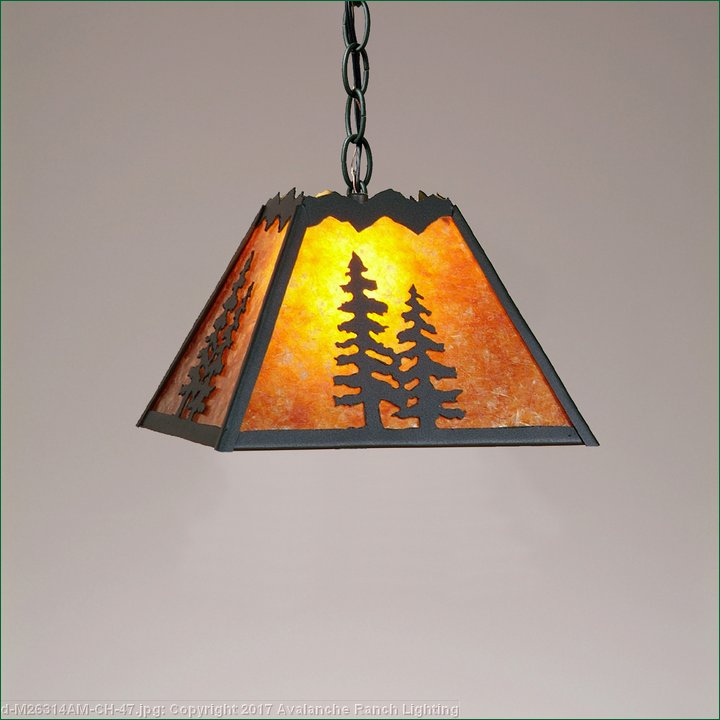 The Rocky Mtn Pendant Small - Spruce features a 11in. wide by 7 in. tall steel frame, with twin spruce metal artwork displayed on all four panels. The fixture includes a square ceiling canopy that can be mounted on either a flat or vaulted ceiling, and comes with a diffuser material choice between Almond or Amber mica. You can choose from the following three hanging choices: a 14 ft black cord (BC), a 15in.-30in. adjustable stem (ST), or 3' of chain (CH). Suitable for interior locations only. This small pendant will add rustic character to any log home, cabin, or northwoods lodge-themed room.
