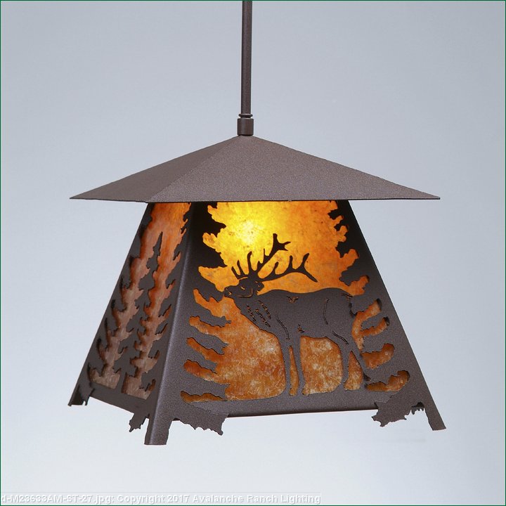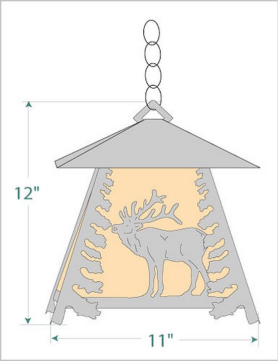 The Smoky Mtn Pendant Large - Elk features an elk image on the two front panels, along with a single spruce tree on the side panels. The fixture has a steel frame, and comes with a diffuser material choice between Almond or Amber mica. Included is a square ceiling canopy that can be mounted on either a flat or vaulted ceiling. You can choose from the following three hanging choices: a 14 ft black cord (BC), a 15in.-30in. adjustable stem (ST), or 3' of chain (CH). The black cord and chain-hung versions are suitable for interior and damp locations, and the adjustable stem-hung version is suitable for wet locations. This small hanging light will add a rustic character to any log home, cabin, or northwoods lodge-themed room.