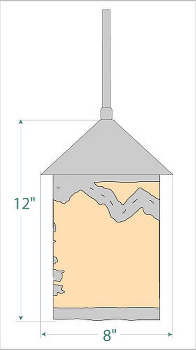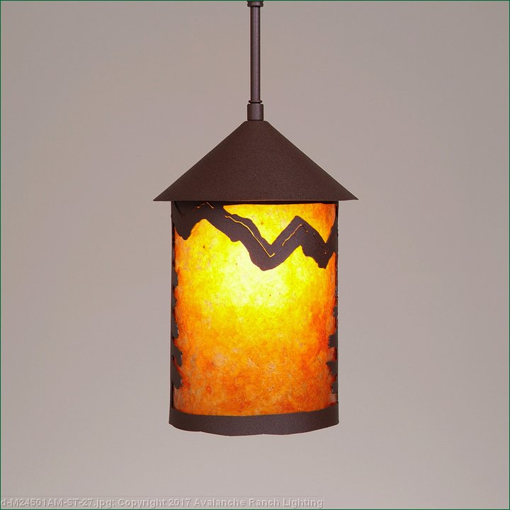 The Cascade Pendant Medium - Rustic Plain features a mountain image on the front and back and spruce trees on either side of the round cylinder. Diffuser choice between Almond or Amber mica. Includes a round ceiling canopy that can be mounted on either a flat or vaulted ceiling. Choice of three ways to hang our pendants: 14 ft black cord, 15 to 27 inch adjustable stem or 3 feet of chain. Black cord or chain hung versions are suitable for interior and damp locations; adjustable stem hung version are also suitable for wet locations. Hanging choice must be specified at time order. Note: Only the Powder Coated Finishes are suitable for wet locations. This rustic pendant is ideal for anyone looking for a small hanging light to add rustic character to their log home, cabin or northwoods lodge-themed room. Includes a round ceiling canopy that can be mounted on either a flat or vaulted ceiling.