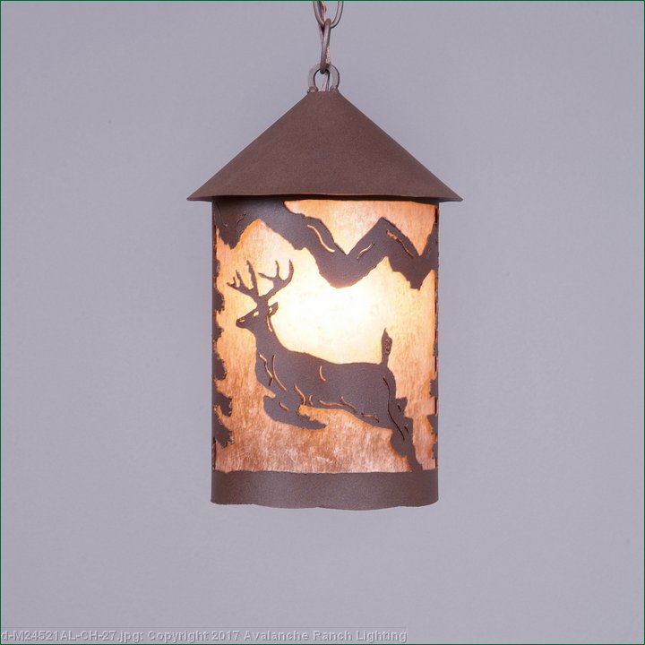The Cascade Pendant Medium - Valley Deer features our exclusive deer art on the front and back, with spruce trees on either side of the round cylinder. Diffuser choice between Almond or Amber mica. Includes a round ceiling canopy that can be mounted on either a flat or vaulted ceiling. Choice of three ways to hang our pendants: 14 ft black cord, 15 to 27 inch adjustable stem or 3 feet of chain. Black cord or chain hung versions are suitable for interior and damp locations; adjustable stem hung version are also suitable for wet locations. Hanging choice must be specified at time order. Note: Only the Powder Coated Finishes are suitable for wet locations. This rustic pendant is ideal for anyone looking for a small hanging light to add rustic character to their log home, cabin or northwoods lodge-themed room. Includes a round ceiling canopy that can be mounted on either a flat or vaulted ceiling.