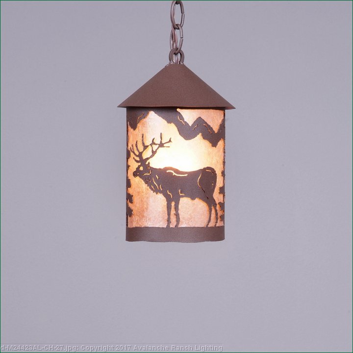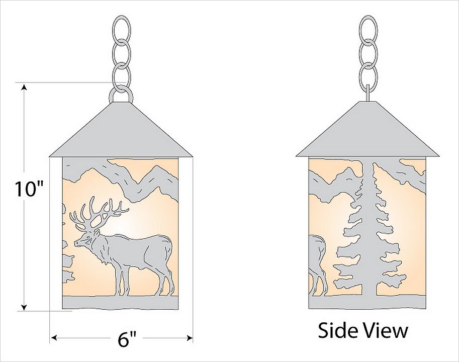 The Cascade Pendant Small - Valley Elk features our exclusive elk art on the front and back, with spruce trees on either side of the round cylinder. Diffuser choice between Almond or Amber mica. Includes a round ceiling canopy that can be mounted on either a flat or vaulted ceiling. Choice of three ways to hang our pendants: 14 ft black cord, 15 to 27 inch adjustable stem or 3 feet of chain. Black cord or chain hung versions are suitable for interior and damp locations; adjustable stem hung version are also suitable for wet locations. Hanging choice must be specified at time order. Note: Only the Powder Coated Finishes are suitable for wet locations. This rustic pendant is ideal for anyone looking for a small hanging light to add rustic character to their log home, cabin or northwoods lodge-themed room. Includes a round ceiling canopy that can be mounted on either a flat or vaulted ceiling.