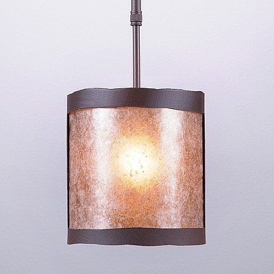 The Kincaid Pendant Small  features a Rustic Drum shape pendants. Mica choice between Almond or Amber. Includes a round ceiling canopy that can be mounted on either a flat or vaulted ceiling. Included with the fixture is 10 feet of wire and two telescoping stems that have a 12 inch adjustment range from 15 to 27 inches. For longer adjustments up to 138 inches, order one or more of the extension kits. A matching 5 by 6 inch ceiling canopy is also included. To add extensions to stem length, use accessory kits for double stem fixtures PK460. For vaulted ceilings, use accessory Kit CK422 This rustic pendant is perfect over a small dining table or kitchen island.  It can be shortened to use a ceiling light too. This rustic pendant is perfect over a small dining table or kitchen island.  It can be shortened to use a ceiling light too.