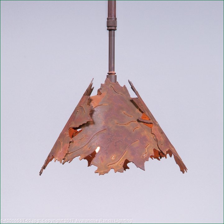 The Mini-Pendant Maple is a small hanging light, which features steel images of maple leaves wrapped into a cone. This rustic steel pendant is ideal for anyone looking for a unique hanging light to add rustic lighting to their home. This item includes a matching ceiling canopy that can be mounted on either a flat or vaulted ceiling. There is a hanging choice of 14 ft black cord (BC), 15 inch - 30in adjustable stem (ST) or 3 ft chain (CH). Hanging choice must be specified at time of order.