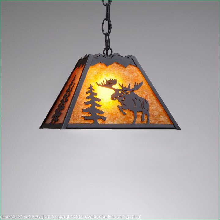 The Rocky Mtn Pendant Small - Alaska Moose features a 12in. wide by 8in. tall steel frame, with a moose image displayed on the two front panels, and a double spruce image on the side panels. The fixture includes a square ceiling canopy that can be mounted on either a flat or vaulted ceiling, and comes with a diffuser material choice between Almond or Amber mica. You can choose from the following three hanging choices: a 14 ft black cord (BC), a 15in.-30in. adjustable stem (ST), or 3' of chain (CH). Suitable for interior locations only. This small pendant will add rustic character to any log home, cabin, or northwoods lodge-themed room.