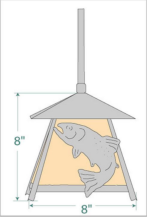 The Smoky Mtn Pendant Small - Trout features a trout image on the two front panels, along with cattail images on the side panels. The fixture has a steel frame, and comes with a diffuser material choice between Almond or Amber mica. Included is a square ceiling canopy that can be mounted on either a flat or vaulted ceiling. You can choose from the following three hanging choices: a 14 ft black cord (BC), a 15in.-30in. adjustable stem (ST), or 3' of chain (CH). The black cord and chain-hung versions are suitable for interior and damp locations, and the adjustable stem-hung version is suitable for wet locations. This small hanging light will add a rustic character to any log home, cabin, or northwoods lodge-themed room.
