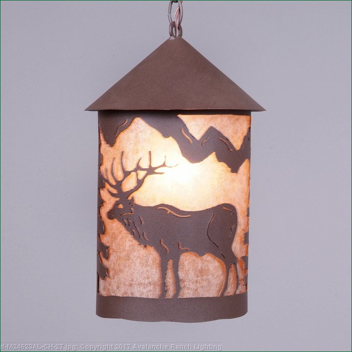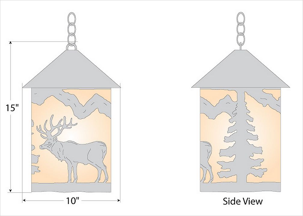 The Cascade Pendant Large - Valley Elk features our exclusive elk art on the front and back, with spruce trees on either side of the round cylinder. Diffuser choice between Almond or Amber mica. Includes a round ceiling canopy that can be mounted on either a flat or vaulted ceiling. Choice of three ways to hang our pendants: 14 ft black cord, 15 to 27 inch adjustable stem or 3 feet of chain. Black cord or chain hung versions are suitable for interior and damp locations; adjustable stem hung version are also suitable for wet locations. Hanging choice must be specified at time order. Note: Only the Powder Coated Finishes are suitable for wet locations. This rustic pendant is ideal for anyone looking for a small hanging light to add rustic character to their log home, cabin or northwoods lodge-themed room. Includes a round ceiling canopy that can be mounted on either a flat or vaulted ceiling.